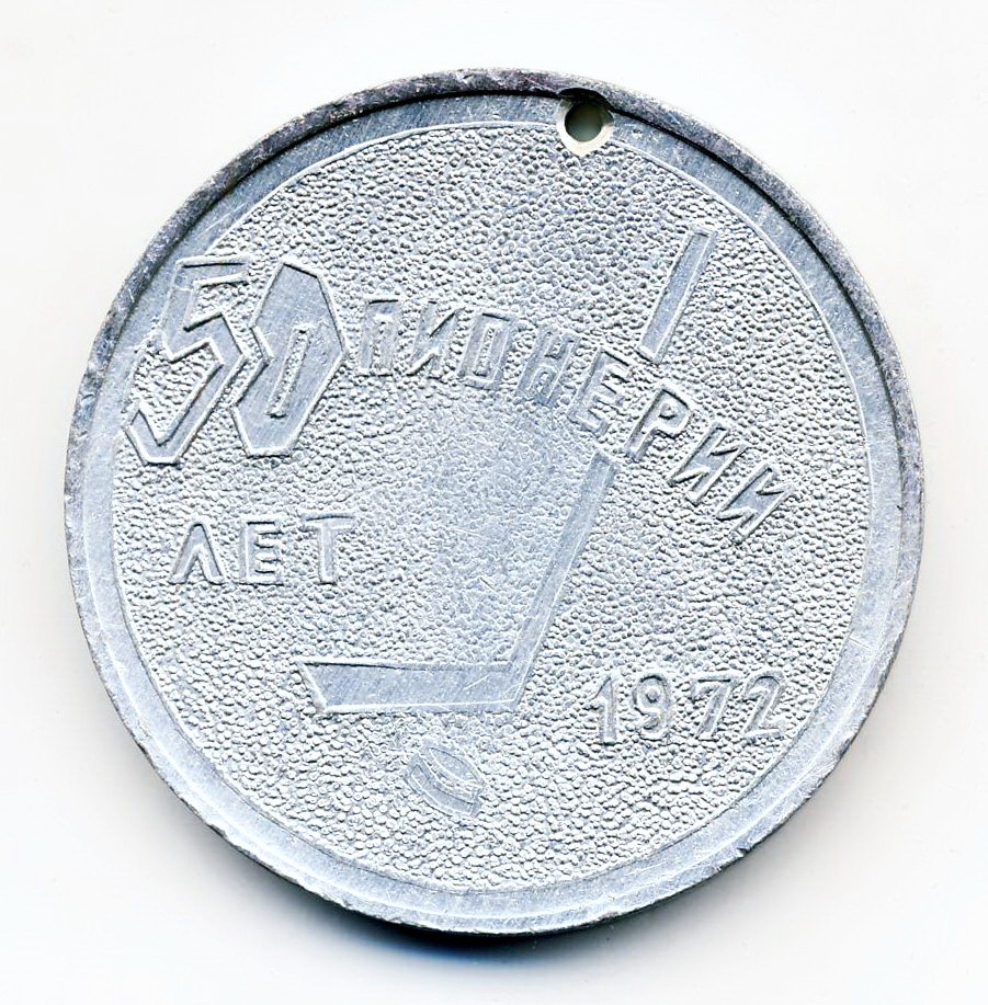 Вариант — меднёный алюминий на чёрной пластиковой подставке Ø120мм с надписью «ПАМЯТНАЯ МЕДАЛЬ ГОРОДСКОГО КОМИТЕТА КОМСОМОЛА “50 ЛЕТ ВЛКСМ.».