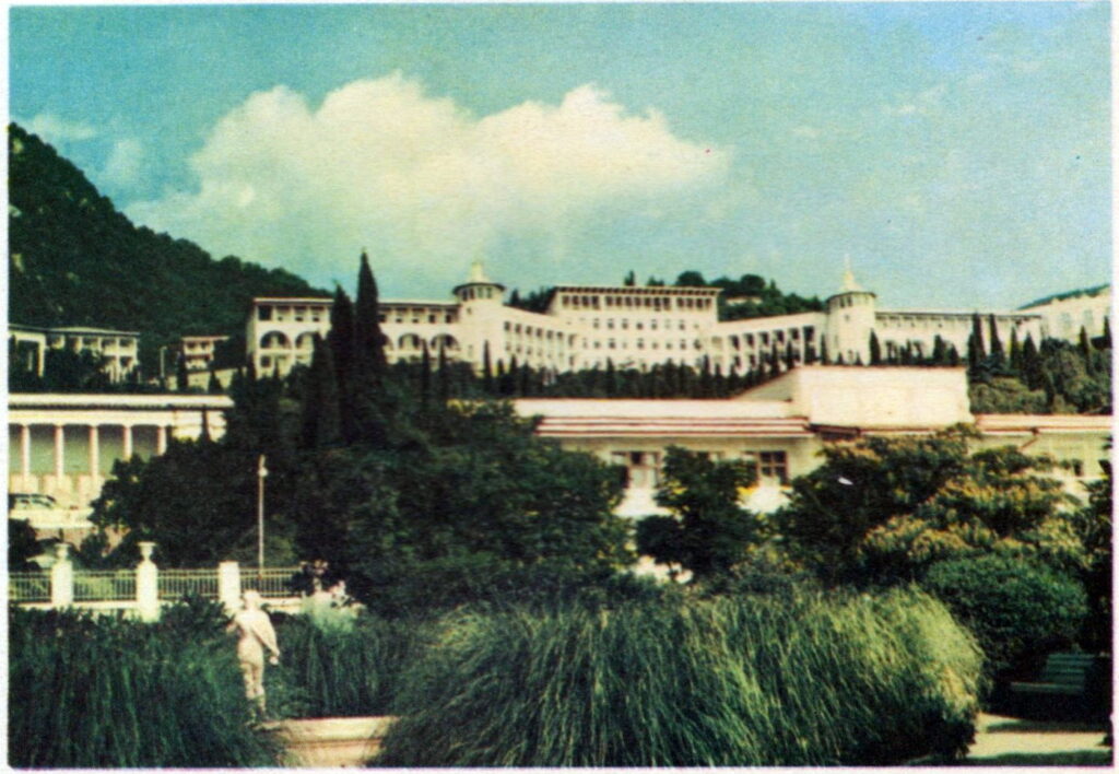 Последний был введён в строй 1 июня 1963 года и оперативно изображён на конверте, вышедшем 16 августа 1963 года с соответствующей подписью. Впрочем, даже если бы подписи не было, то не узнать его невозможно – такой курортной архитектуры я больше нигде не встречал, ну по крайней мере, в Крыму. Вот она во всей красе представлена на почтовой открытке середины 1960-х годов.