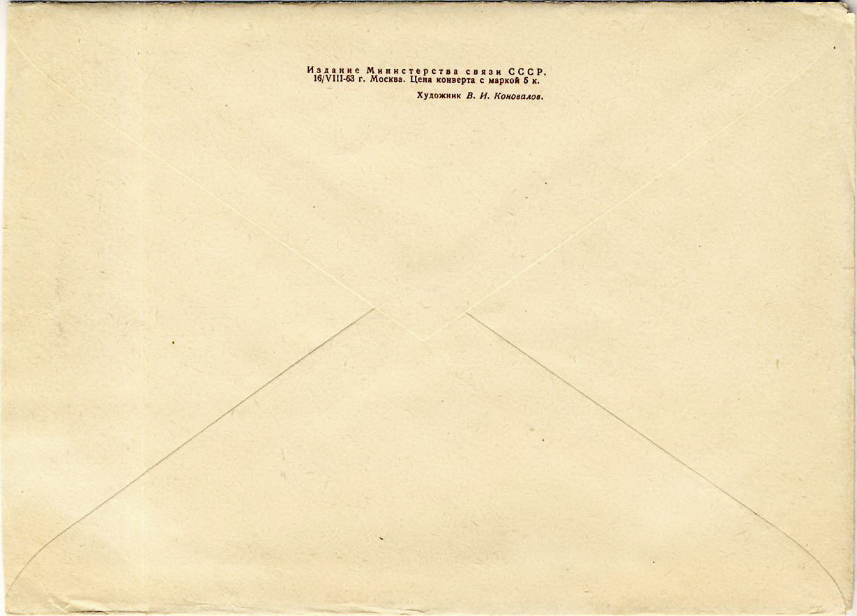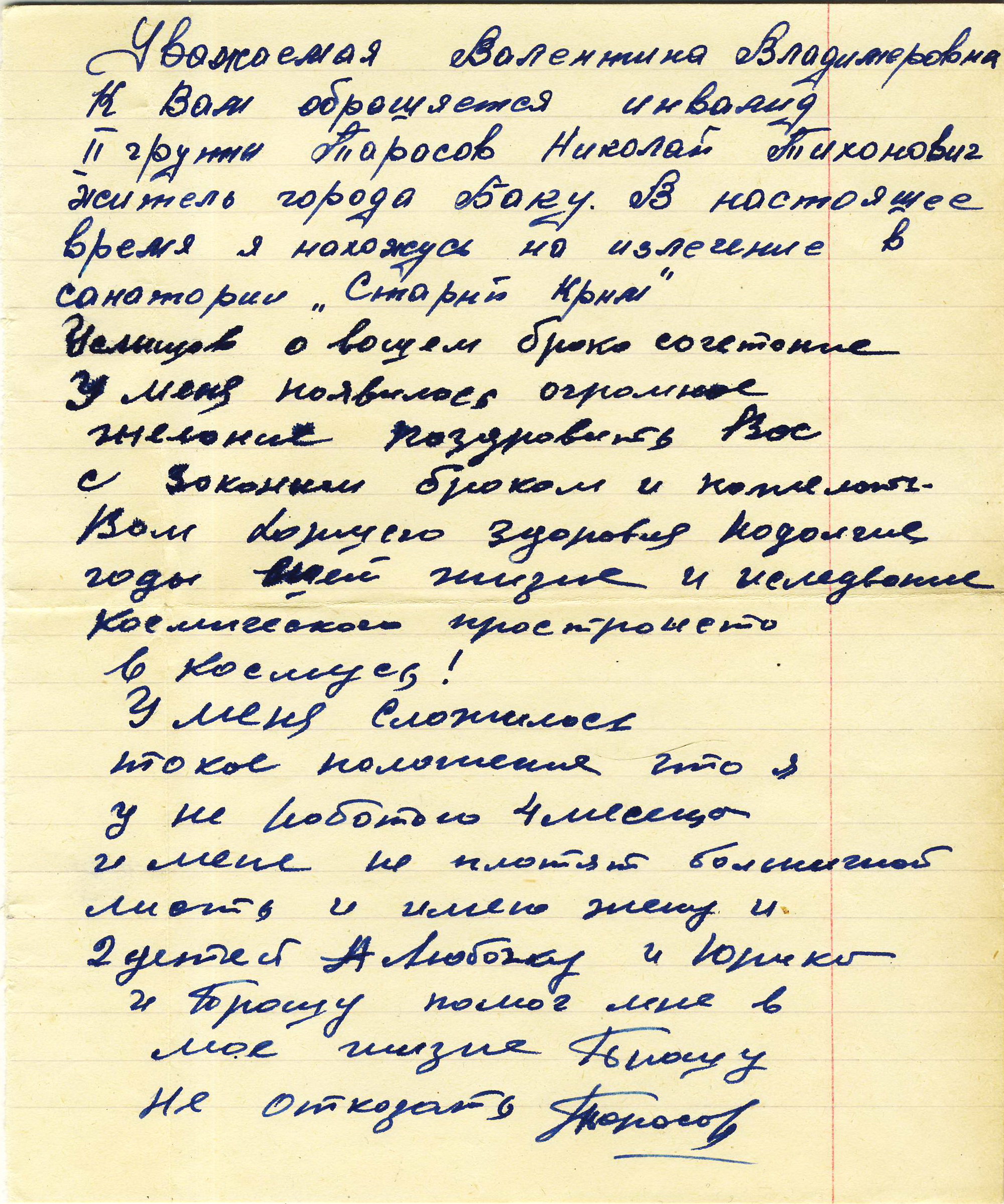 Возможные сомнения окончательно развеял текст письма, вложенного в конверт. Отправитель сначала поздравил адресата со свадьбой. И обратите внимание, дата отправления конверта (по штемпелю) 5 ноября 1963г., а свадьба космонавтов В.Терешковой и А.Николаева состоялась всего за пару дней до этого – 3 ноября. Быстро же отправитель узнал об этом и сориентировался, что можно не просто поздравить космических молодожёнов, но и попробовать воспользоваться радостным поводом для решения своих проблем. Впрочем, похоже, письмо не дошло до адресата, на нём нет никаких пометок – ни адресата, ни какой-либо канцелярии (например, Звёздного городка). Да и тот факт, что письмо оказалось на интернет-рынке и по не очень дорогой цене для такого экземпляра конверта, тоже говорит в пользу такого предположения.