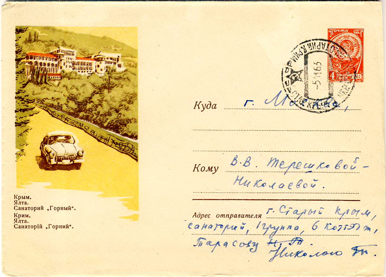Правда, запрашиваемая на маркетплейсе цена этого ХМК (художественного маркированного конверта) была несколько высоковата для аналогичной почтовой продукции тех годов. Обычно так бывает, когда на прошедшем почту конверте название населённого пункта на оттиске штемпеля и на изображении на конверте совпадают. В этом случае это не так – на штемпеле указана не Ялта, а Старый Крым (городок недалеко от Судака и Коктебеля). Но тут мой взгляд задержался на адресате этого почтового отправления – В.В. Терешкова-Николаева! Неужто та? Ну а кому ещё можно так адресовать – Москва и ФИО?! И быть вполне уверенным, что дойдёт по назначению.