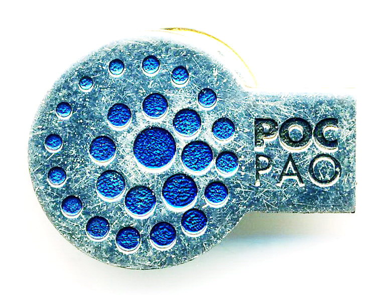 Щит с полукруглым выступом сверху 12х20мм. Анодированный алюминий. Красная и голубая эмаль. Булавка.