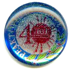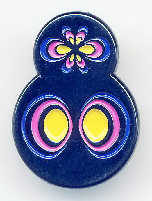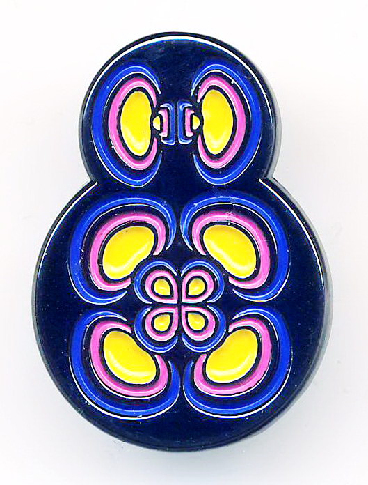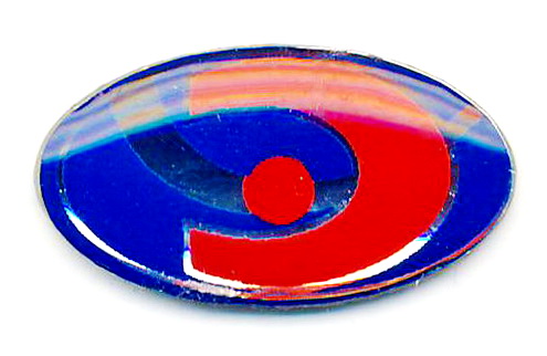 Правильный шестиугольник со стороной 15мм. Алюминий. Синяя и красная эмаль. Булавка. На реверсе – снежинка.