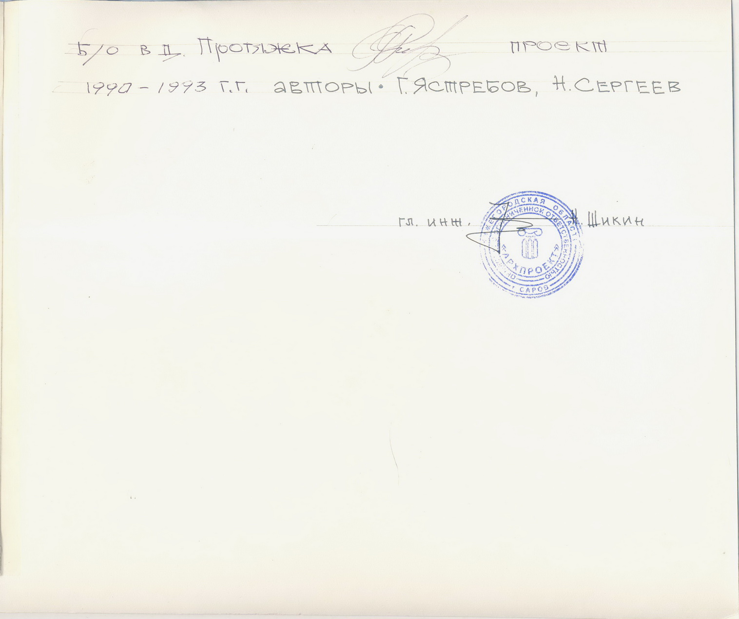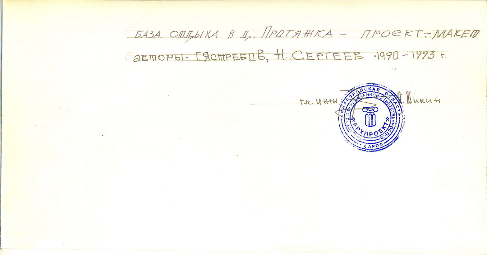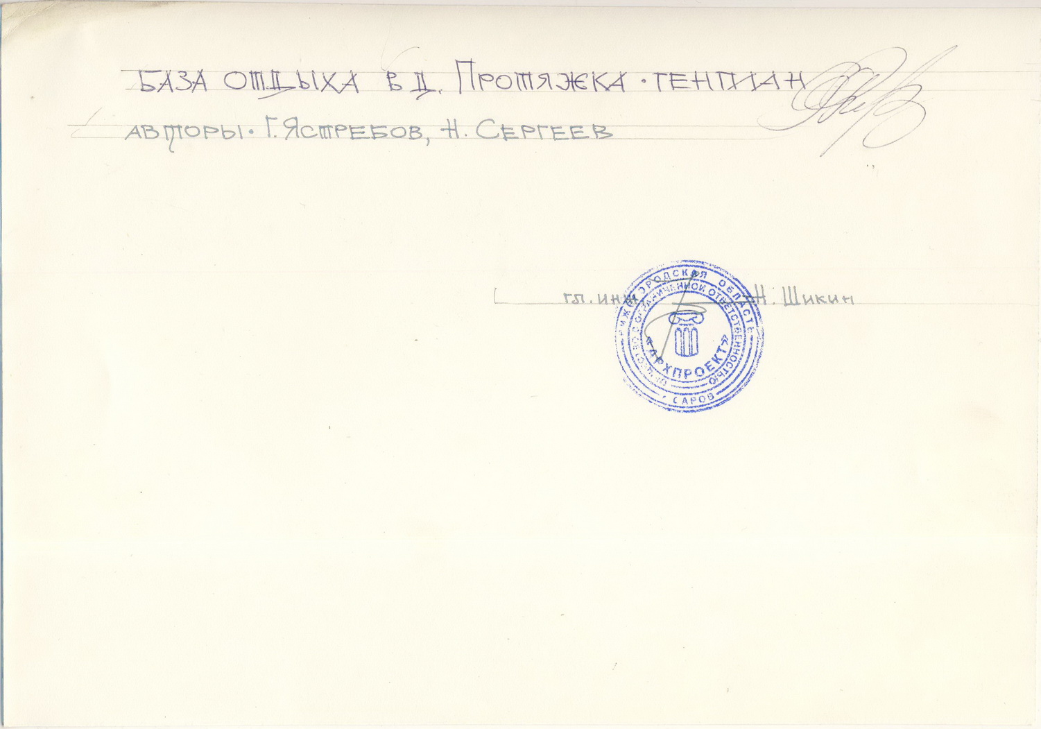 Продолжим просмотр папки с фотографиями проектов архитектора Г.И.Ястребова, переданных автору его сыном Д.Г.Ястребовым. В которой представлены как широко известные в Сарове, так и неосуществлённые проекты. На этот раз о проекте, полностью неосуществлённом – база отдыха на Протяжке. Точнее сказать, на фото написано “в д.Протяжка”, где “д” видимо означает деревня? Но решение о ликвидации посёлка (а не деревни) на Протяжке было принято Горсоветом ещё в 1965 году! Нестыковка, однако!