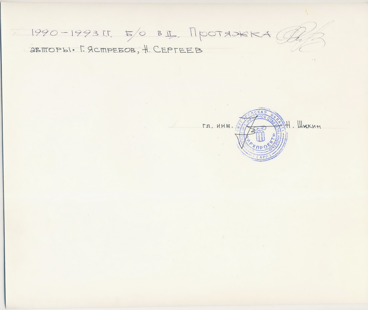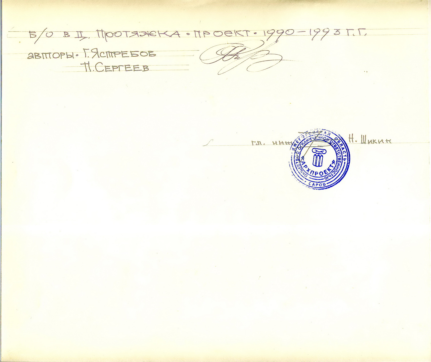 И ещё одна деталь, отличающая этот проект от других, представленных в папке. В качестве автора проекта указан не только Г.Ястребов, но и Н.Сергеев. Возможно, это тот художник Николай Сергеев, который работал под началом Г.Ястребова в группе монументалистов УС-909.
