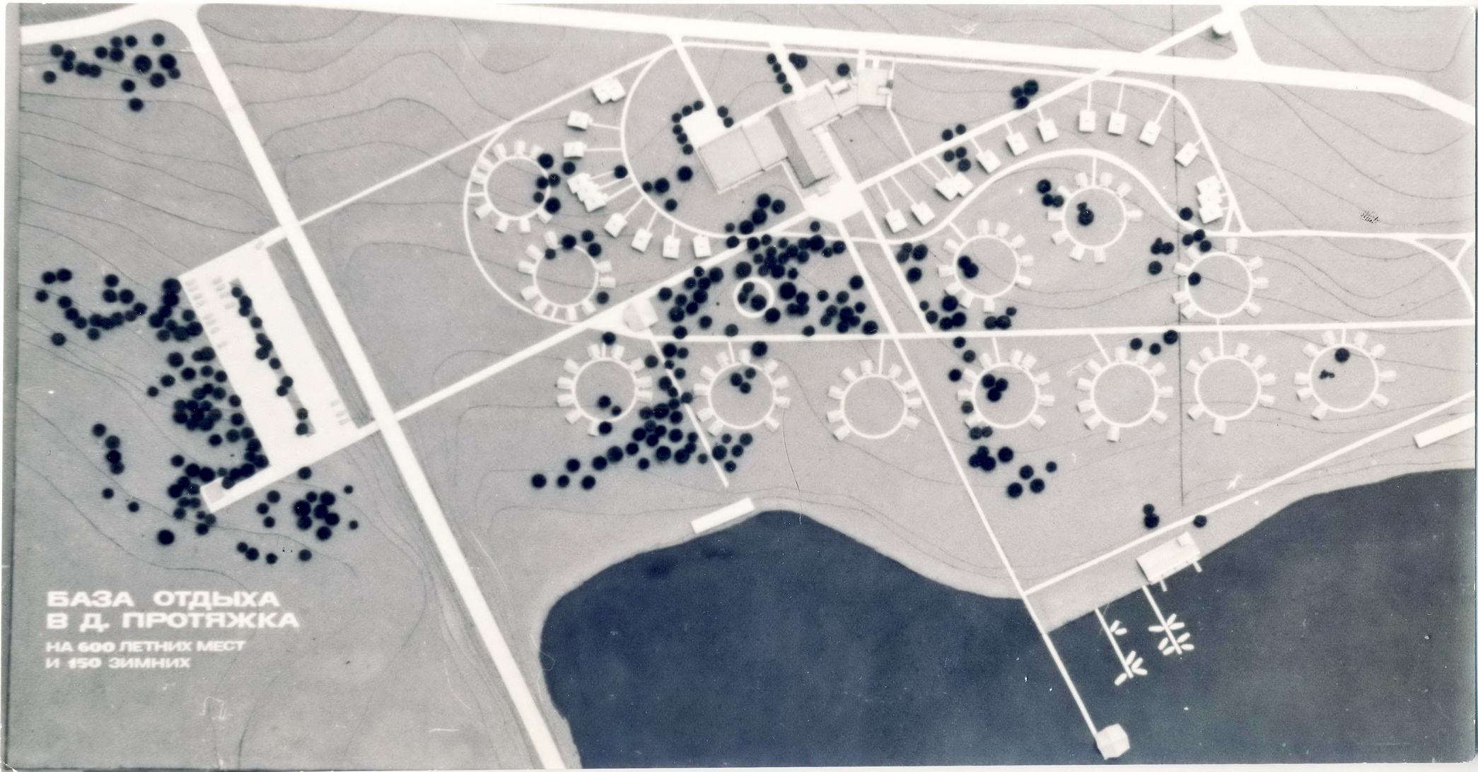 Судя по плану из упомянутой выше папки, проектируемая база отдыха должна была располагаться на северном берегу озера Протяжное и занимать большую часть существующего пляжа плюс территорию западнее от него, где находится небольшой перелесок с несколькими лавочками и столиками. Фактически она представляла из себя развитие концепции базы отдыха строителей «Дубки», но вместительнее – на 600 летних и 150 зимних мест. Должна была состоять из более сотни разнокалиберных домиков – одноэтажных летних на 4 места, сгруппированных по десятку в двенадцати «ромашках» и более двадцати двухэтажных зимних на 6 мест, расположенных вокруг корпуса, а также самого зимнего служебного корпуса. К сожалению, качество фотографий не позволяет рассмотреть экспликацию более подробно, удалось только разобрать, что в ней упоминается общественный корпус со столовой на 300 посадочных мест, мангалы на общих площадках, детская игровая площадка, лодочная станция, спортплощадка и бассейн. По планировке корпуса можно предположить, что именно в нём и был предусмотрен встроенный летний бассейн с высокой двускатной крышей (по одному плану полуоткрытый, по другому – застеклённый), крытые залы (спортзалы?), зимняя столовая с кухней и прочие служебные помещения. С юга базы на берегу озера/пруда был запланирован причал с лодками и складское помещение – видимо эллинг для зимнего хранения лодок. На востоке за дорогой на плане располагается какое-то сооружение в виде большого прямоугольника с деревьями посередине – очистные? А вокруг водоёма изображена дорога с небольшими ответвлениями к берегу – видимо места для рыбалки? Впрочем, судите сами. Вот фото из альбома, относящиеся к Протяжке.