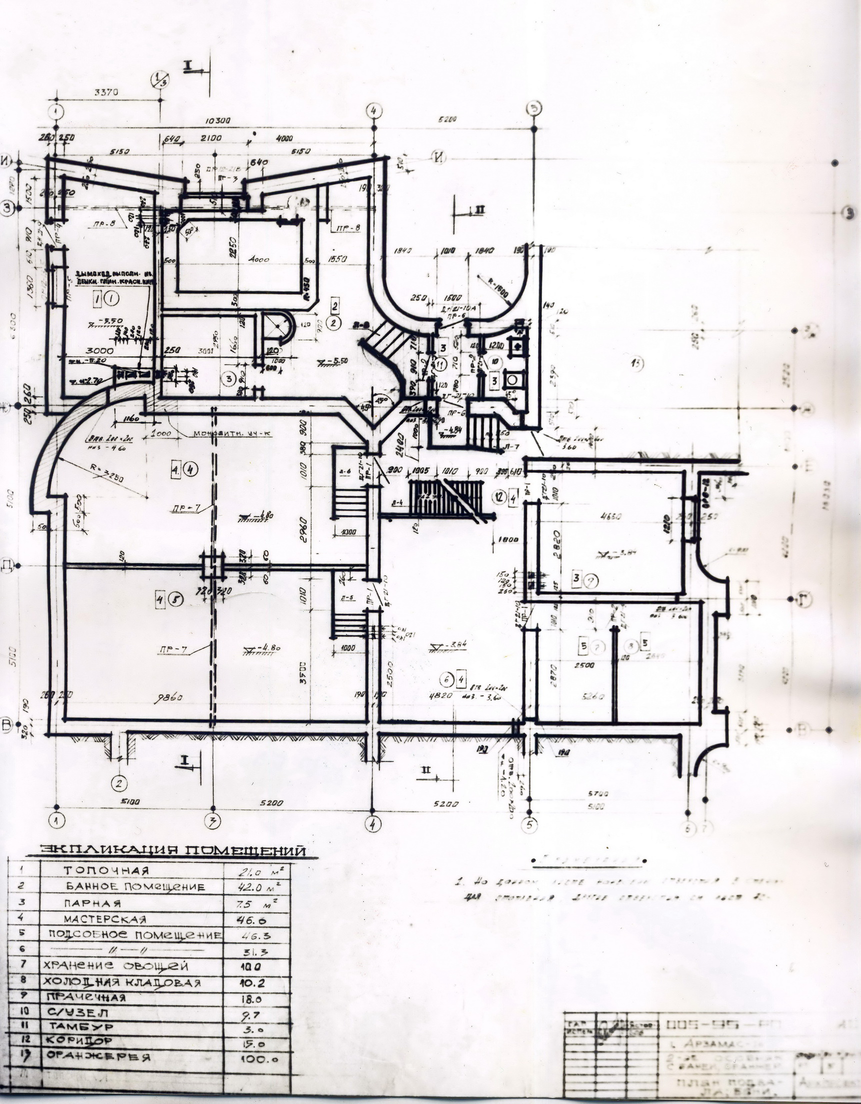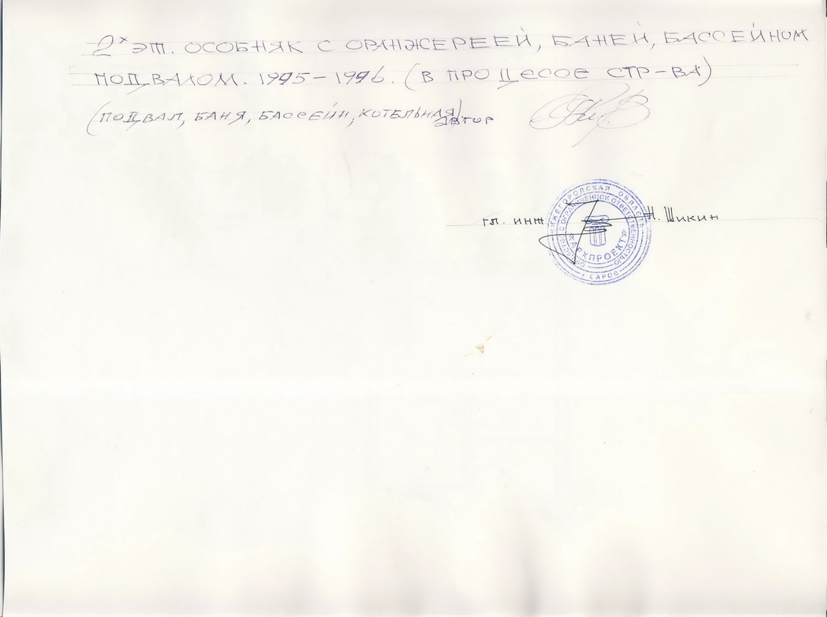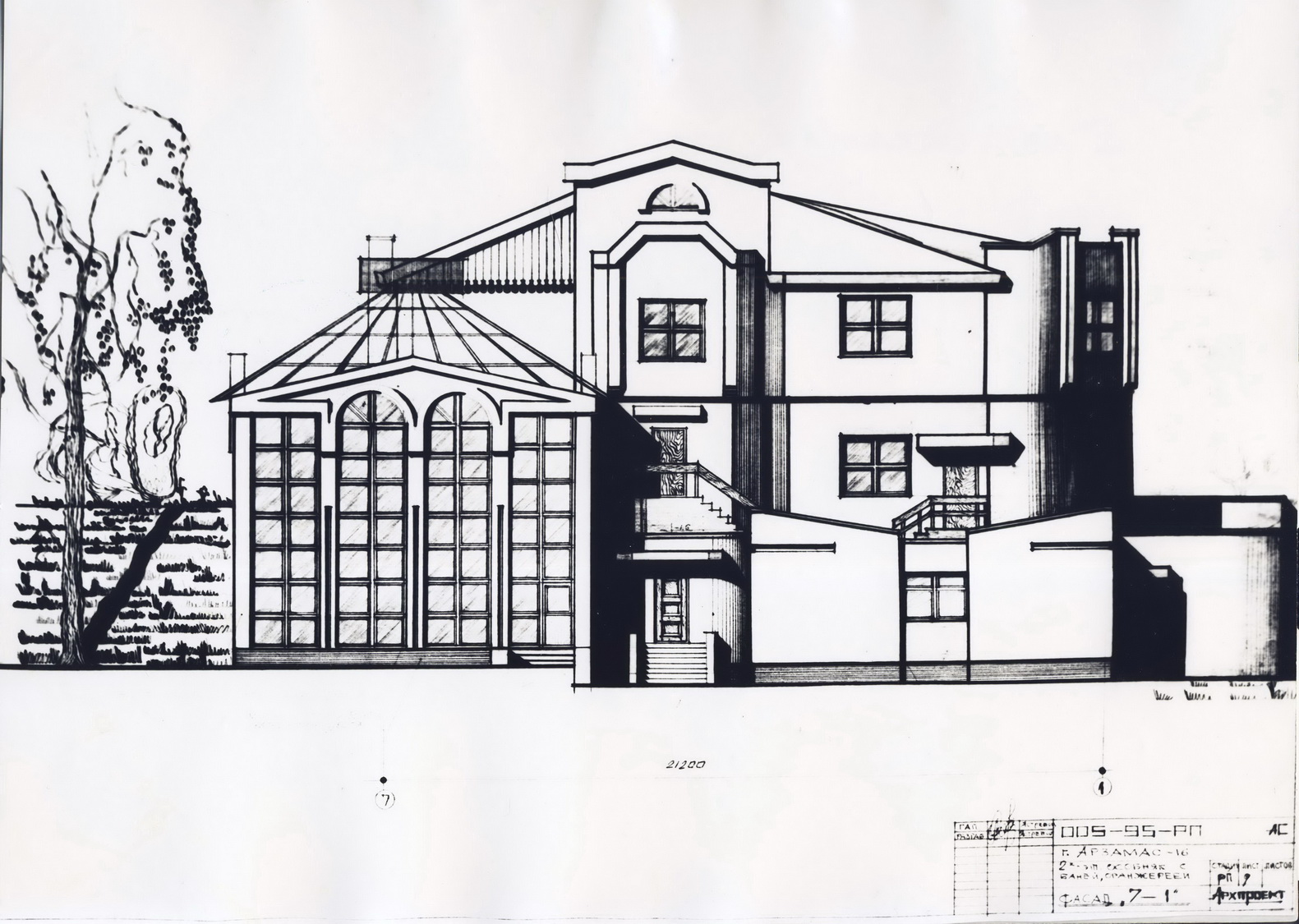 Продолжим просмотр папки с фотографиями проектов архитектора Г.И.Ястребова, переданных автору его сыном Д.Г.Ястребовым. В которой представлены как широко известные в Сарове, так и неосуществлённые проекты. На этот раз о проекте, осуществлённом наполовину (и то, временно) – «2-х эт. особняк с офисом (баня, бассейн, оранжерея, подвал)» на р.Сатис. Я бы даже сказал вилла – основание примерно 20х21м, т.е. общая площадь двух этажей с подвалом более 1000м²!