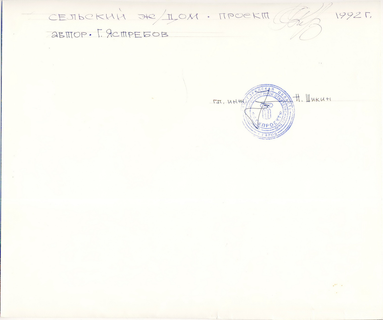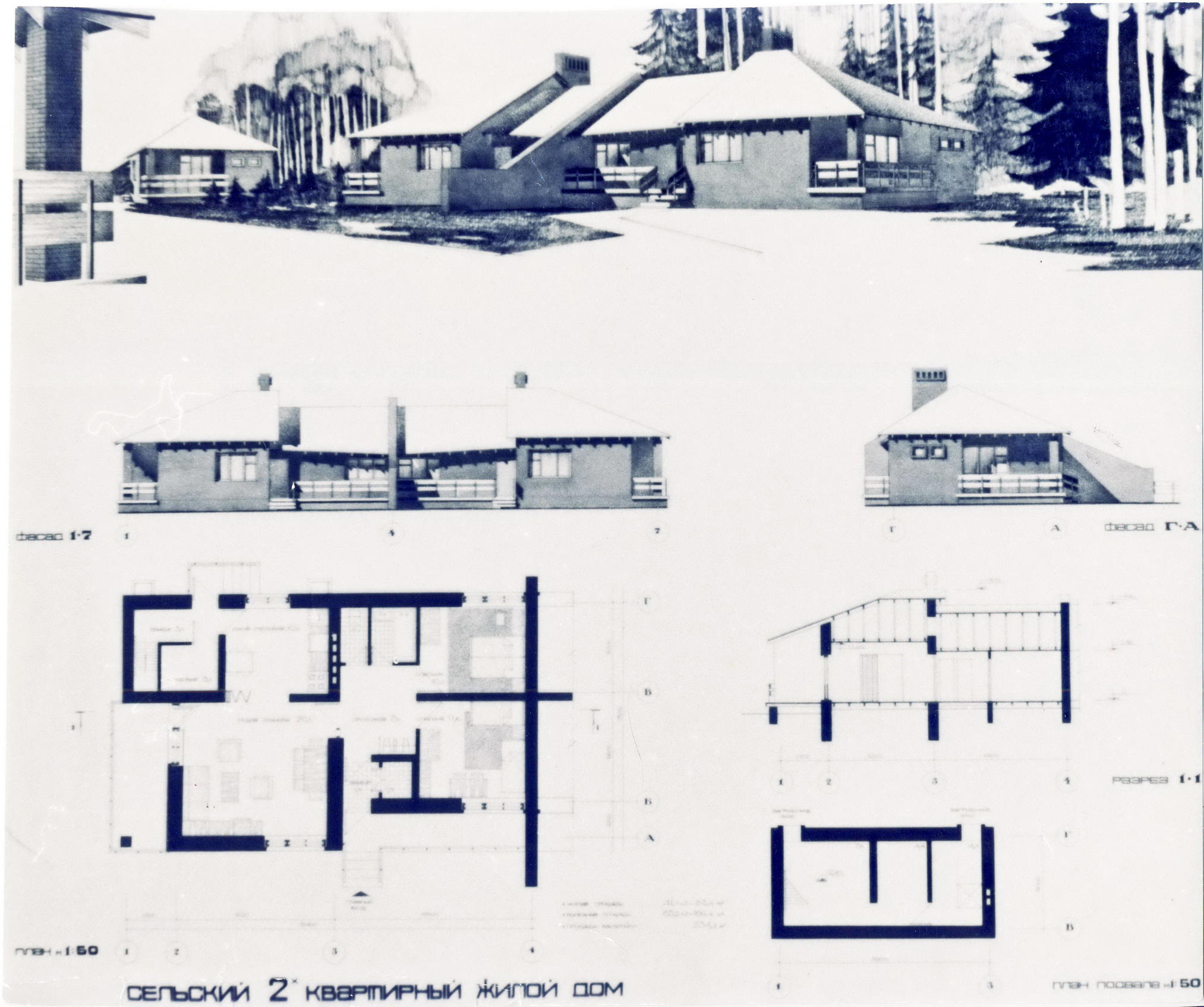 Сначала проект «сельский 2-х квартирный дом». Судя по надписям на обороте фото, проект 1992 года, но печать сзади ООО «Архпроект», зарегистрированного в 1993 году. Больше об этом проекте ничего не известно.