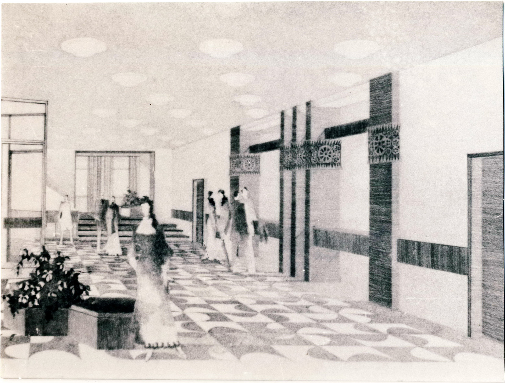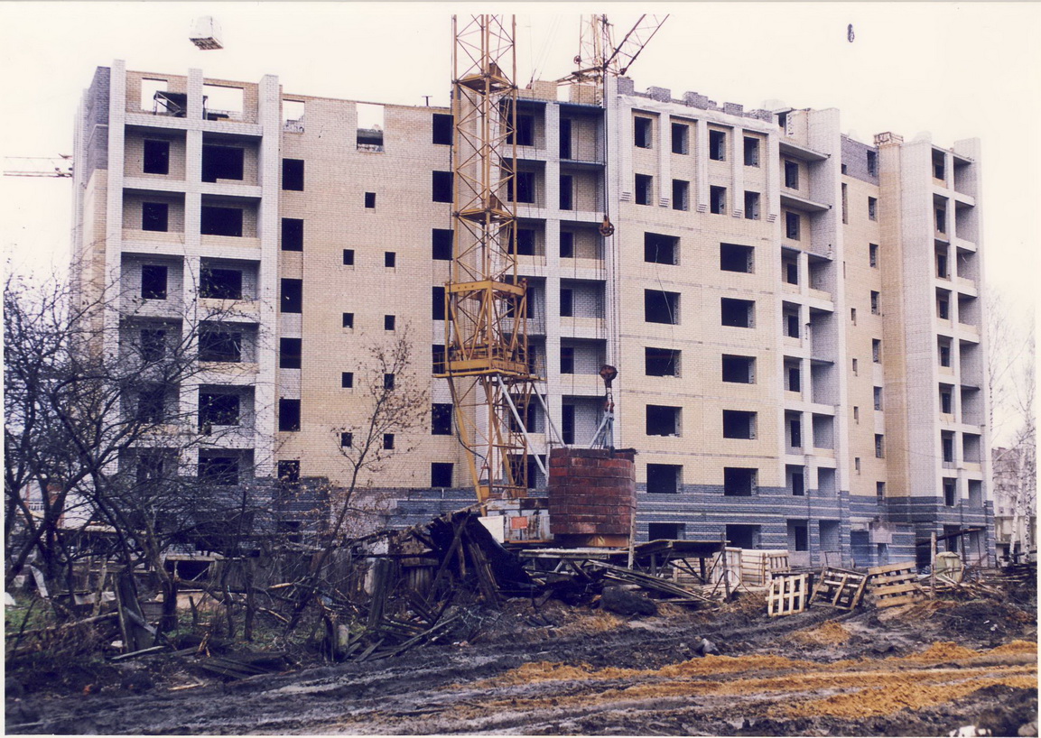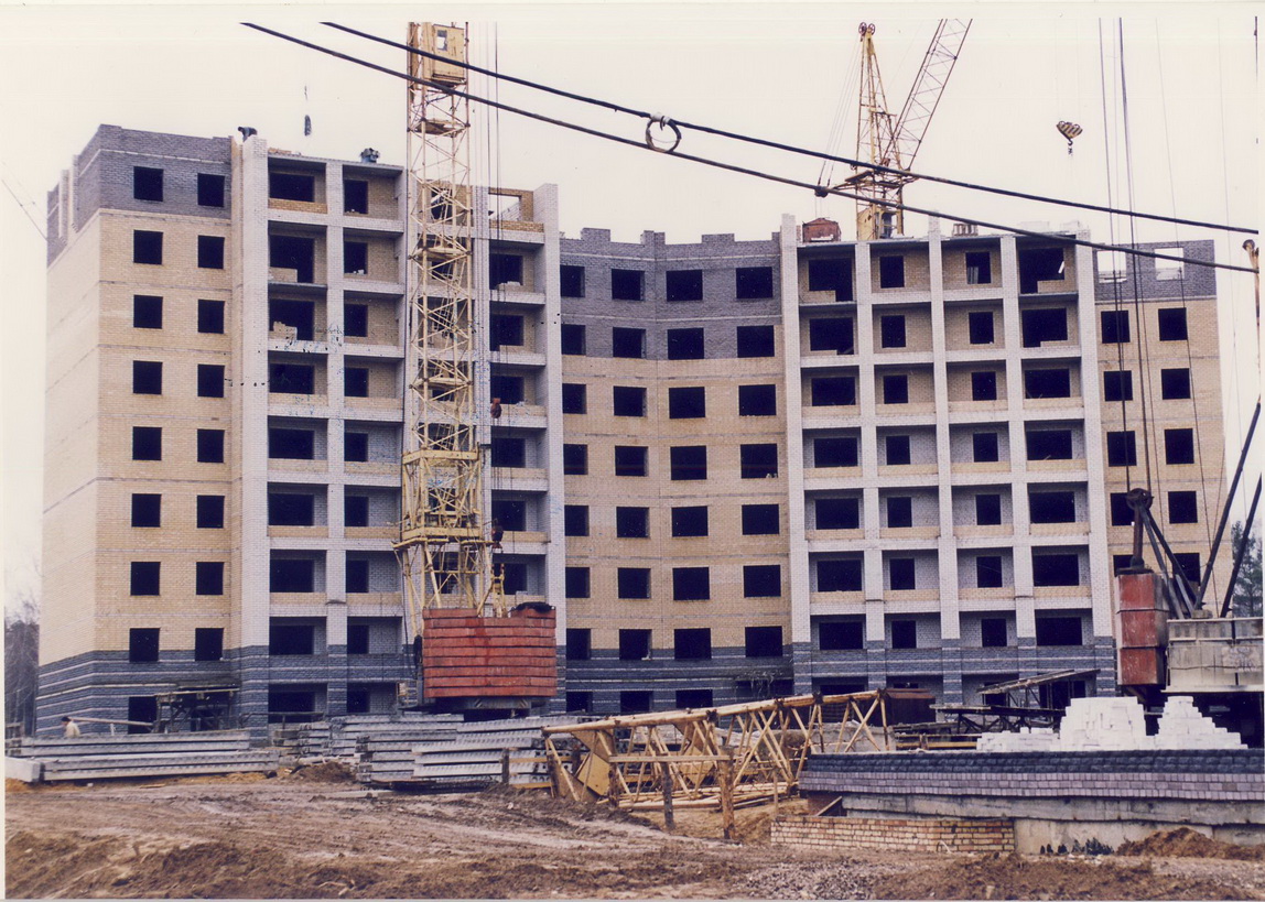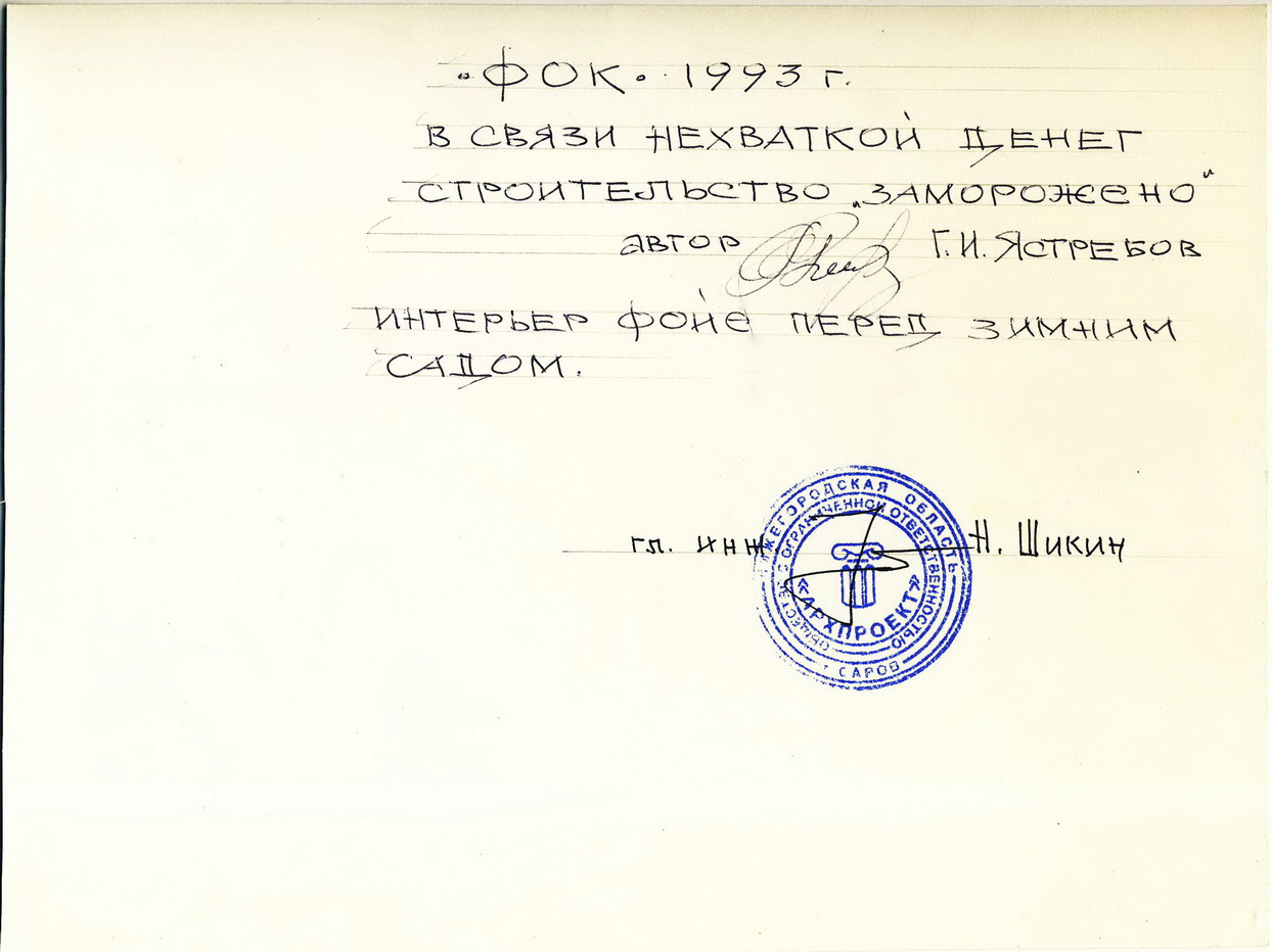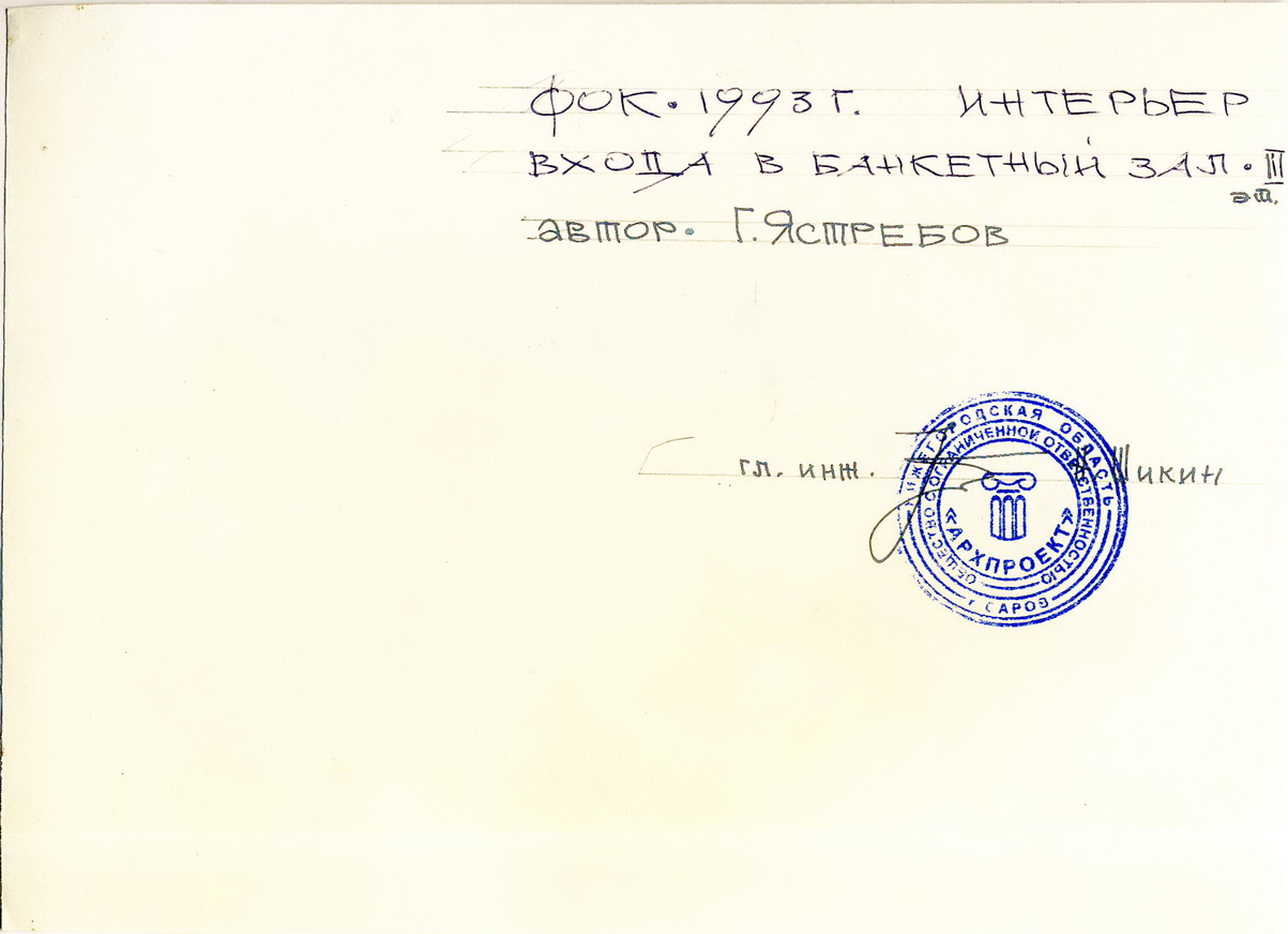 «Многострадальный» проект ФОК 1993 года. В папке только два фото по нему и оба относятся к внутреннему пространству ФОКа – «Интерьер входа в банкетный зал» и «Интерьер фойе перед зимним садом». И действительно, насколько помню, проект ФОКа был разработан не городскими архитекторами и местным осталось заниматься только интерьерами. Первоначально планировалось расположить его на северо-западном краю сносимого в то время Новофинского посёлка на пустующем до сих пор месте рядом с перекрёстком улиц Зернова и Садовая. Подпись на обороте одного из фото констатирует, что «в связи с нехваткой денег строительство заморожено». Действительно, за 30 лет разные городские администрации несколько раз пытались найти финансирование на этот большой и дорогой проект, но это так и не удалось до сих пор. И сейчас вроде пришли к мысли строить упрощённый (и, соответственно, удешевлённый) вариант ФОК – ФОКОТ (ОТ – открытого типа) и совершенно в другом месте – на востоке микрорайона 15. Что ж, народные мудрости ещё никто не отменял – «лучше синица в руках…». Ну а большой ФОК – «до лучших дней».