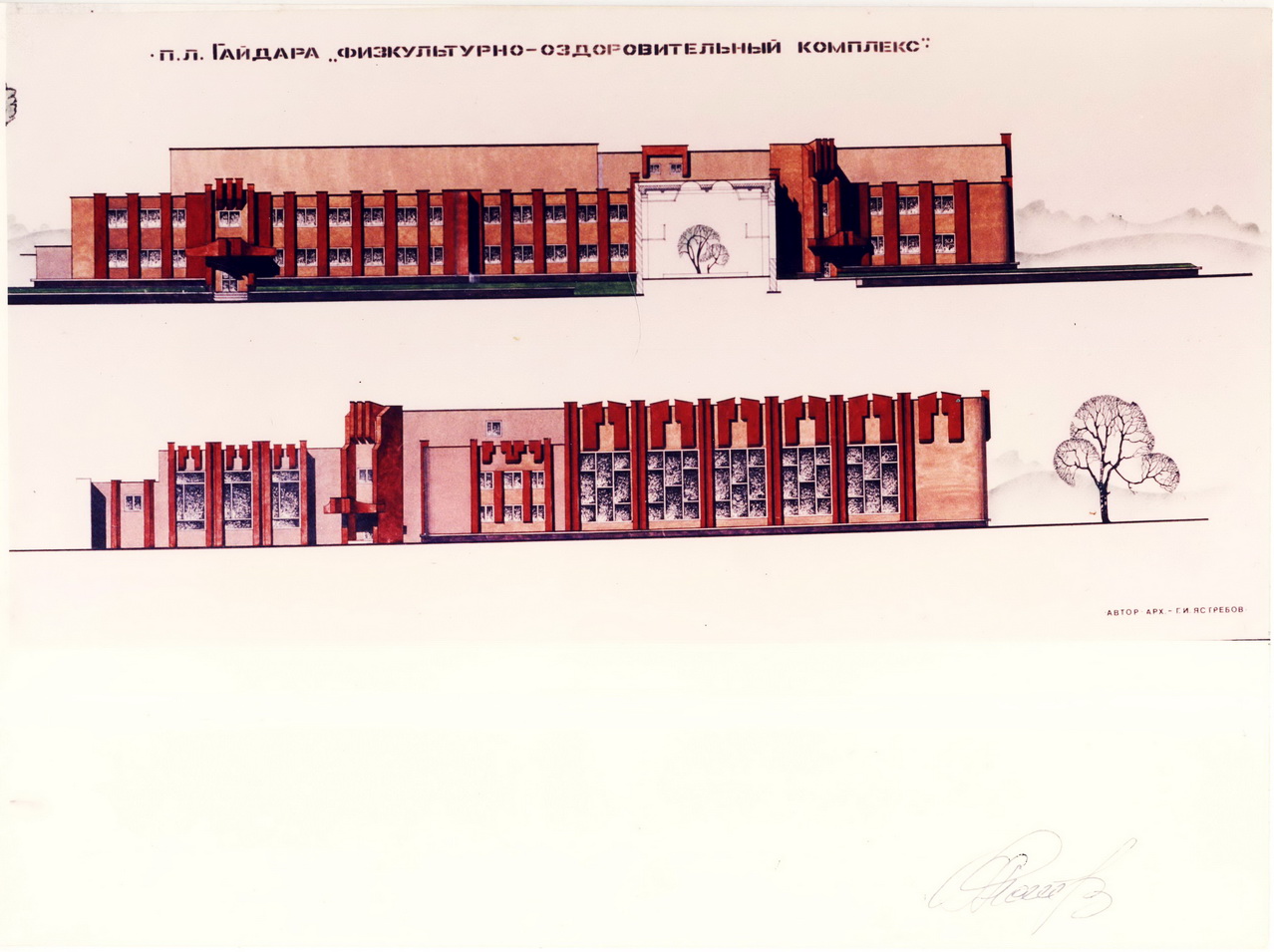 Немного больше можно сказать о следующем проекте – «п.л. Гайдара “физкультурно-оздоровительный комплекс”» 1993 года. Это пионерский лагерь 3-го завода «Авангард», построенный в 1976 году в Мордовии на реке Мокша около с. Пурдошки (примерно в 30 км от Сарова). Но что-то такого здания ФОК я там не припоминаю. Впрочем, был там всего пару раз и то лет 30 назад, так что мог и подзабыть.