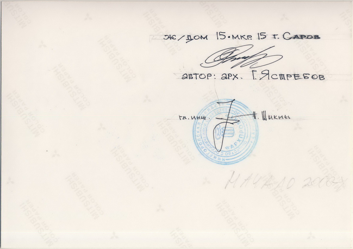 Ну и, наконец, видимо последний осуществлённый проект архитектора Г.И.Ястребова – «ж/дом 15 мкр 15 г.Саров». Этот дом расположен внутри микрорайона, который был построен в начале 2000-х годов недалеко от городского кладбища, где через несколько лет после реализации последнего проекта упокоился и сам автор этого проекта. Как-то символично получилось.