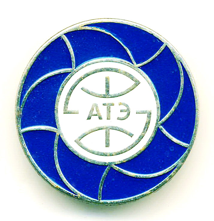 В виде логотипа компании «АСЭ» треугольной формы 44х32мм. Жёлтый металл. Синяя эмаль под смолой. Цанга. Клеймо УФЛЕКУ.