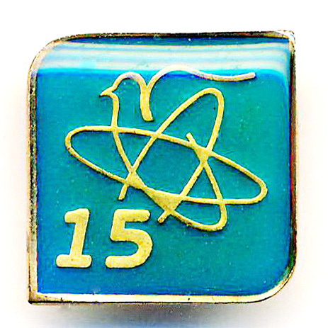 Форма схемы атома 19х23мм. Жёлтый металл. Синяя и желтоватая эмаль. Цанга. Из собрания Н.Г.Калашникова (ИФВ).