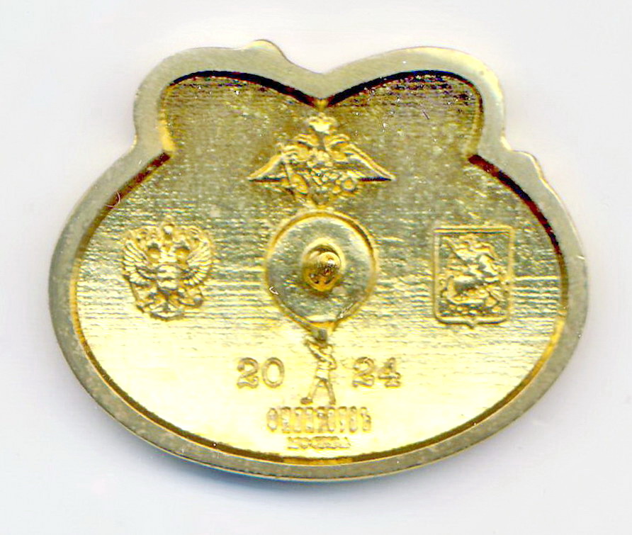 Щит 34х45мм с новой накладной эмблемой РЭА. Накладной щит из белого металла на жёлтом металле. Синяя горячая эмаль. 2 цанги.